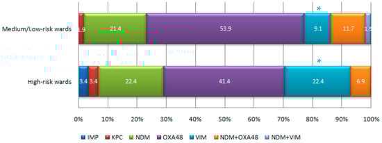 As for carbapenemase distribution between high- and medium/low-risk wards, the proportion of VIM carbapenemase was found to be significantly higher in high-risk ones (Figure 6).