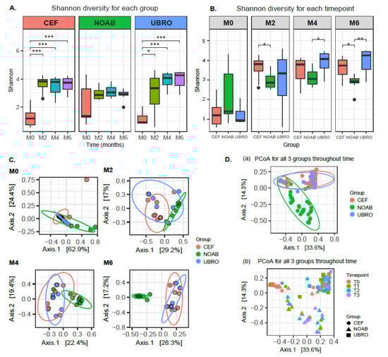 (A) Alpha diversity of milk microbiota using Shannon index between all time-points for each group. The plot shows significant differences in diversity between milk obtained at M0, M2, M4 and M6 for both the antibiotic-treated groups (UBRO and CEF). (B) Alpha diversity using Shannon index between the three groups (NOAB, UBRO and CEF) at all time-points. Plot shows no significant difference between groups at M0, while significance between antibiotic and no-antibiotic group was seen at later time points. (C) PCoA plot using Bray–Curtis distance matrix between the three groups at all time-points, showing distinct clustering between groups. (D) PCoA plot using Bray–Curtis distances (a) showing distinct clustering of all three groups, with antibiotic groups clustering discretely compared to the no-antibiotic group; and plot (b) showing separate grouping of points between groups and time-points. * p-value ≤ 0.05; ** p-value ≤ 0.01; *** p-value ≤ 0.001.