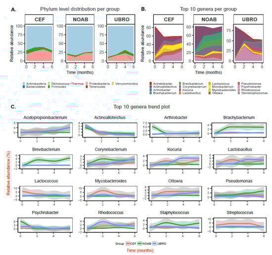 (A) Phylum level distribution of taxa in all three groups across all time points. (B) Overall top 10 genera in all three groups (NOAB, UBRO and CEF) at all time-points. (C) Trend plots at genera level, showing relative abundance of top 10 genera from all three groups (NOAB, UBRO and CEF) over time with confidence interval of 95% (with different Y-axis scale for each taxa).