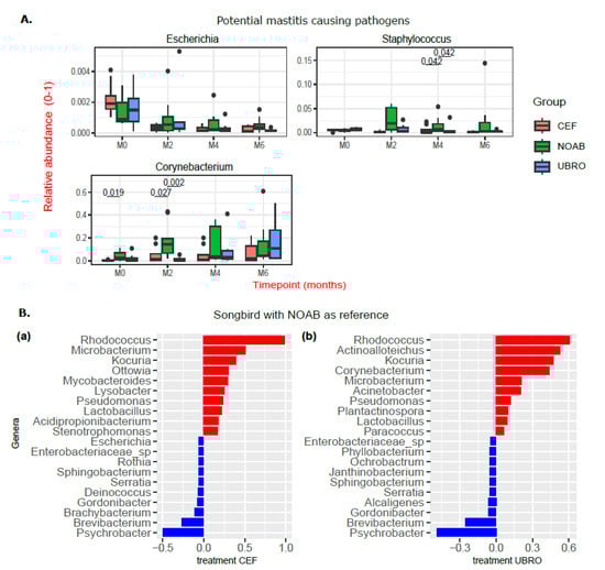 (A) Boxplots showing abundance of potential mastitis-causing pathogens in milk of all three groups (NOAB, UBRO and CEF) over time of lactation. Significance was determined using Wilcoxon test in R, and p.adj values < 0.05 are considered significant. The black dots correspond to the outliers. (B) Songbird differentials obtained using the formula C (Group, Treatment(‘NOAB’)) were sorted by ranks and the top 10 positive and negative features are plotted and depicted using bar charts. NOAB group is reference (negative here is more associated with reference group—NOAB here) and (a) and (b) are top 10 positive and negative associations with treatment group CEF and UBRO respectively.