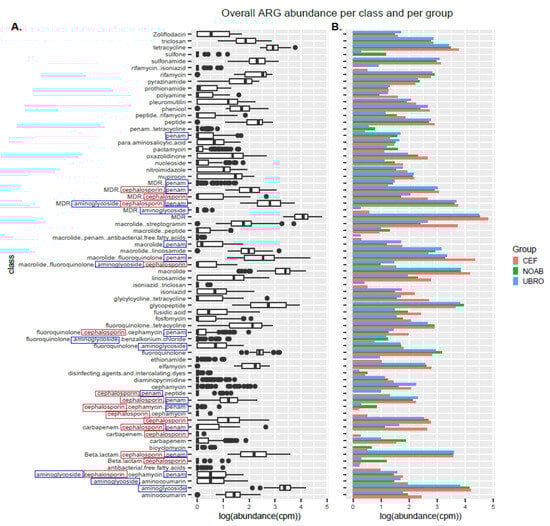 (A) Boxplot showing log-transformed abundance of the different classes of antibiotics to which resistance was observed in this study. (B) Bar plot showing representation of ARGs in all three groups (NOAB, UBRO and CEF) over all time-points. The classes highlighted in blue boxes correspond to the class of antibiotics administered to the UBRO group, while those in red boxes correspond to the CEF group.