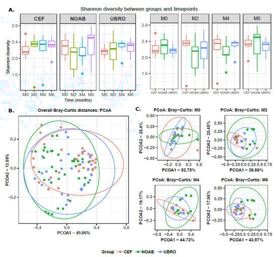 (A) Alpha diversity with Shannon index shows no difference between groups (NOAB, UBRO and CEF) at any time points for ARG abundance. (B) Beta diversity of ARGs using PCoA and Bray–Curtis distance. (C) Beta diversity of ARGs at each time point using PCoA plot with Bray–Curtis distance.