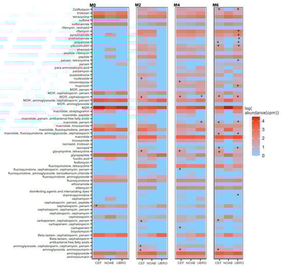 The CEF group showed the highest ARG abundance, with both antibiotic-treated groups showing a higher ARG abundance compared to the NOAB group (Figure S3). The abundance of genes conferring resistance to the drug class cephalosporin at M0 was higher in abundance in the CEF group. Multiple comparisons between groups (NOAB group as control) were performed for each class and high resistance was found in the antibiotic groups (Figure 6).