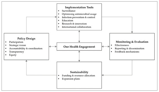 In our analysis of the ASEAN NAPs, we referenced the AMR governance framework published by Anderson et al. and adapted it by incorporating new domains and regrouping existing ones [16]. The updated framework now features five domains on policy design, implementation tools, monitoring and evaluation, and sustainability, with One Health engagement as the centrepiece (Figure 2). This updated framework guided our data collection and analysis [12].