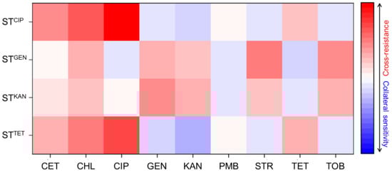 Heat map of fold changes in MICR of ciprofloxacin-resistant Salmonella Typhimurium (STCIP), gentamicin-resistant S. Typhimurium (STGEN), kanamycin-resistant S. Typhimurium (STKAN), and tetracycline-induced resistant S. Typhimurium (STTET) compared to MICWT of S. Typhimurium ATCC 19585 (STWT). Heat map intensities indicate the fold change in MIC compared to that of the untreated STWT; [log2 MICR/MICW]. CET, cefotaxime; CHL, chloramphenicol; GEN, gentamicin; KAN, kanamycin; PMB, polymyxin B; STR, streptomycin, TET; tetracycline; TOB, tobramycin.