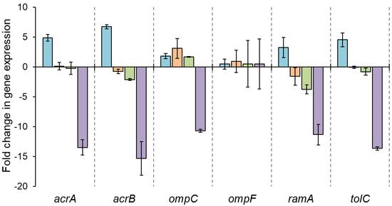 The relative expression levels of efflux pump- and porin-associated genes were observed in the antibiotic-induced resistant mutants (Figure 2). The relative expression levels of acrA, acrB, ramA, and tolC were increased in STCIP. The genes acrA, acrB, ompC, ramA, and tolC, were suppressed more than 10-fold in STTET.