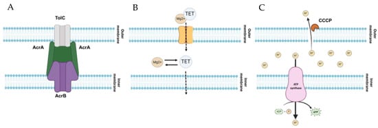 Schematic diagrams depicting AcrAB-TolC efflux pump system (A), outer membrane porin (B), and proton gradient-induced ATP (C).