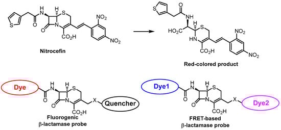 - Ding, Y.; Li, Z.; Xu, C.; Qin, W.; Wu, Q.; Wang, X.; Cheng, X.; Li, L.; Huang, W. Fluorogenic Probes/Inhibitors of Β-Lactamase and Their Applications in Drug-Resistant Bacteria. Angew. Chem. Int. Ed. 2021, 60, 24–40. [Google Scholar] [CrossRef] [PubMed]