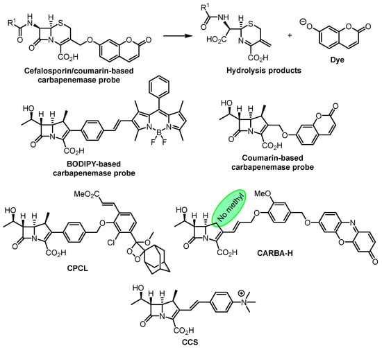 - Mao, W.; Xia, L.; Xie, H. Detection of Carbapenemase-Producing Organisms with a Carbapenem-Based Fluorogenic Probe. Angew. Chem. Int. Ed. 2017, 56, 4468–4472. [Google Scholar] [CrossRef] [PubMed]