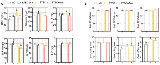 The effect of gentamicin on cytokines and fecal bacteria in ETEC-challenged piglets. (A) Cytokines’ measurement in serum. (B) Measurement of bacteria in feces. n = 8, mean ± SEM. ANOVA followed by Tukey’s multiple comparisons test. Different lowercase letters within each group indicate significantly different values (p < 0.05).
