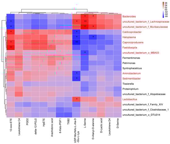 Correlation matrix between specific metabolites and microbiota (spearman correlation, *, p < 0.05, **, p < 0.01).