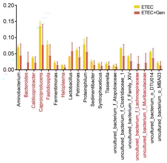Screening of microorganisms. Graph showing the selected microorganisms that differed significantly between the ETEC-challenged and gentamicin-treated piglets.