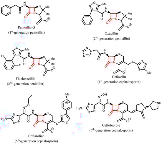 Structures of β-lactams used for the treatment of S. aureus infections [4,5]. The core 4-member β-lactam ring is highlighted in red.