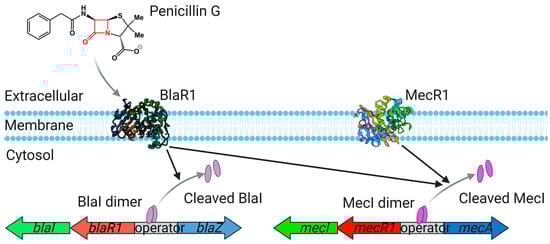 Regulation of blaZ and mecA. The bla or mec gene clusters encode regulatory systems that sense β-lactams on the cell surface through a membrane-embedded sensor–inducer BlaR1 (PDB: 1XA7)/MecR1 (PDB:6O9S) [60]. The signal generated by β-lactam detection induces the cleavage of a cytoplasmic transcriptional repressor BlaI/MecI. This results in the expression of blaZ and mecA genes, which encode BlaZ and PBP2a, respectively.