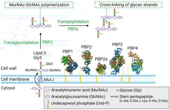 Penicillin-binding proteins (PBPs) are a family of membrane-bound proteins involved in the final steps of bacterial cell wall assembly [65,66]. They are essential for the synthesis of peptidoglycan, the main component of the cell wall. PBPs catalyze the polymerization of glycan chains and cross-link them into a mesh-like hydrogel through their transglycosylase (TGase) and transpeptidase (TPase) activities, respectively [67]. Penicillin and other β-lactam antibiotics bind to PBPs, especially via the TPase domain, and prevent them from cross-linking peptidoglycan chains, leading to a weakened cell wall and subsequent bacterial death.