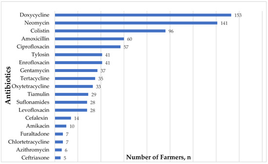 Out of 605 farmers in our study, 340 farmers could recall 828 different events that prompted them to use antibiotics on their birds. In general, the tetracycline (28%, n = 228/828) class of antibiotics was most used by the farmers, followed by aminoglycoside (23%) and fluoroquinolones (15%) (Figure S1). Individually, doxycycline (n = 153/828) was the most used antibiotic, followed by neomycin (n = 141/828), colistin (n = 96/828), and amoxicillin (n = 60/828), respectively (Figure 1). Our data also revealed that cephalosporins were not routinely used among poultry farmers in Nepal. Cefalexin (a first-generation cephalosporin) was used by only 14 farmers whereas ceftriaxone (a third-generation cephalosporin) was used by only five of the 605 poultry farmers. Although furazolidone and other members of the nitrofuran class of antibiotics were banned across several regions and countries for their potential carcinogenic effect, seven farmers reported having used the antibiotics in their birds as they are widely available over the counter in Nepal. Additionally, out of 605 farmers, 295 (n = 48.8%) had previously experienced that the antimicrobials they were using on their farm were not working properly.