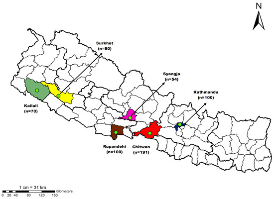 This study was conducted in 6 districts of Nepal: Kailali from Sudurpashim Province, Surkhet from Karnali Province, Rupandehi from Lumbini Province, Syangja from Gandaki Province, Chitwan, and Kathmandu from Bagmati Province (Figure 3). In Nepal, there are 29.19 million people, and among them, around 55 thousand engage in poultry farming, with chickens being produced commercially in 64 of the country’s 77 districts [59]. In the most recent report of the “Agriculture and Livestock Diary Report No. 2079” published on 17 April 2022, there are 73,418,077 hens and 427,226 ducks in Nepal and among them, 11,374,011 laying hens and 220,532 laying ducks [11]. Nepal produced 226,959 metric tons of chicken meat, 442 metric tons of duck meat, and around 1.47 billion chicken eggs and 17.9 million duck eggs in 2020/21. The study population was poultry farmers who were aged > 18 years, actively engaged in poultry production, and/or involved in the decision pattern of antimicrobial administration.