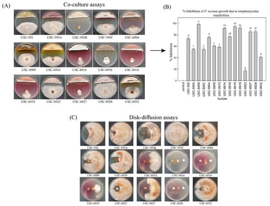 The 15 selected antifungal Streptomyces isolates underwent fermentation and extraction of their natural products. The resulting fermentation extracts were further tested for persistent antifungal activity using the Kirby-Bauer disk-diffusion method (Figure 1C). USC-595B demonstrated persistent strong antifungal activity, and USC-6916 and USC-6928 also displayed a substantial increase in antifungal activity compared with the initial co-culture assays (Figure 2A). The antifungal activity of some of the Streptomyces isolates, including USC-6904, USC-6927, USC-6910, and USC-6909, was reduced. This decrease might be due to the absence of antifungal volatile compounds or compound degradation during solvent extraction and evaporation. Based on these disk-diffusion activity assays, isolates presenting with the strongest activities and, therefore, of interest include USC-595B, USC-6904, UCS-6914, USC-6916, USC-6918, USC-6919, USC-6927, and USC-6928. These isolates and their closest related species can be linked to previous studies demonstrating antifungal activities. For instance, USC-595B was found to be most similar to Streptomyces platensis, which was identified as a strong antifungal strain [,,]. Resormycin is an herbicidal and antifungal antibiotic isolated from S. platensis, which demonstrated activity against numerous fungal phytopathogens []. Wan et al. (2008) also found S. platensis to be an effective biocontrol agent for the suppression of many plant-pathogenic fungi, including Botrytis cinerea, Rhizoctonia solani, and Sclerotinia sclerotiorum. Additionally, biosynthetic gene clusters of Phoslactomycins (PLMs), which are polyketide natural products and important antifungals, were identified from S. platensis []. USC-6904 and USC-6914 were most similar to S. catenulae, which demonstrated antifungal activity against the fungal pathogen P. citriasiana []. USC-6916 was most similar to S. gelaticus, which was assessed for antifungal activity against basal stem rot caused by Ganoderma boninense using co-culture assays and found to produce up to 100% inhibition. The subsequent crude extracts generated from this strain demonstrated activity of around 87.5% inhibition from a 10% concentration []. USC-6918 was most similar to S. luozhongensis, which was found to have antifungal activity against Saccharomyces cerevisiae, Aspergillus flavus, A. niger, Penicillium citrinum, and Candida albicans []. USC-6919 was most similar to the thermophilic S. thermocarboxydus, which was shown to be a promising biocontrol agent against strawberry anthracnose caused by Glomerella cingulate []. USC-6927 was most similar to S. alni and was found to have antifungal activity against the root rot of grapevine []. USC-6928 was most similar to S. diastaticus, which was found to produce the macrolide antibiotics oligomycin A and C, which exhibited strong activity against A. niger, Alternaria alternata, B. cinerea, and Phytophthora capsica []. This further exemplifies the biopotential of these isolates to produce antifungal secondary metabolites for the purposes of biocontrol.