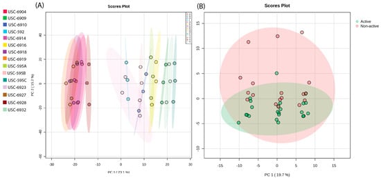 (A) Two-dimensional PCA score plot demonstrating the differential production of metabolites between the fifteen Streptomyces isolates across the positive and negative ionisation modes (PC1 × PC2) and (B) a score plot comparing the active and non-active fermentation extracts.