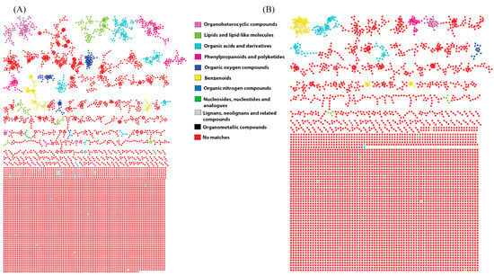 Termite gut-associated streptomycetes molecular network coloured by 11 chemical class terms as indicated by the legend. Chemical class annotation was performed using MolNetEnhancer within the GNPS framework (A) class annotated MN in a positive ionisation mode and (B) class annotated MN in a negative ionisation mode.