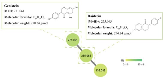 Flavonoids and isoflavonoids are versatile natural products with extensive pharmacological activities. They have extremely low toxicity, making them compounds of interest and a “hotspot” for drug discovery and development []. However, research on flavonoids has favoured plant sources, resulting in relatively less focus on microorganisms as potential sources for novel flavonoids [,,]. Within this class, a cluster of isoflavones, including daidzein (m/z 255.065 [M+H]+) and genistein (m/z 271.061 [M+H]+), were tentatively identified within the GNPS library (Figure 4). One study found that 10% of their 200 tested soil Streptomyces isolates produced daidzein and genistein and that genistein increased the production of polyketide antibiotics by 11–42% within its fermentation extracts []. The potential discovery of new isoflavonoids may be found in termite-associated streptomycetes as a study found three new isoflavonoid glycosides, which were isolated from termite-associated Streptomyces spp. recovered from the cuticle of South African termites, and as such were named termisoflavones A-C. These isolates were also found to produce daidzein and genistein []. Derivatives of daidzein and genistein, 7-O-β-D-glucosyl-genistein and 7-O-β-D-glucosyl-daidzein, have also demonstrated considerable antifungal activity against P. citricarpa, meaning there may be potential for antifungal activity against P. noxium []. These two compounds were produced in isolates USC-595C, USC-595A, USC-6928, and USC-6916.