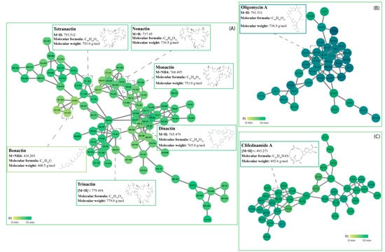 Macrotetrolide cluster identified in the termite gut-associated streptomycetes molecular network. Nodes represent an individual metabolite; each node displays its parent mass and is coloured based on its retention time. (A) macrotetrolides (B) macrocyclic lactones (C) polycyclic tetramate macrolactums.