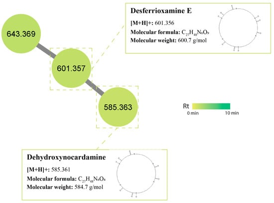 Desferrioxamines are the principle siderophores produced by Streptomyces species []. Studies have shown that streptomycetes are able to use their siderophore production as a means to ‘starve’ fungi of iron [] as an antagonistic mechanism. A cluster of siderophore peptides was also identified within the MN, including desferrioxamine E (synonym: nocardamine) (m/z 601.356 [M+H]+) which is a siderophore widely produced by Streptomyces species [] and was found in isolates USC-595A and USC-592. Derivatives of this compound, also found in streptomycetes and identified as dehydroxynocardamine (m/z 585.631 [M+H]+), were found in isolate USC-592 (Figure 7).