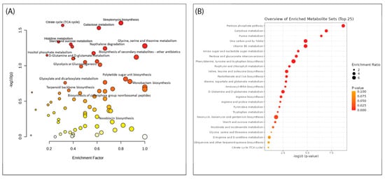 (A) Pathway enrichment and (B) overrepresentation analyses generated in Metaboanalyst 5.0 of all 15 of the Streptomyces isolates from the MS data. The size of the circle is indicative of the pathway impact score, while the colours are based on the p-value (the darker the colour, the higher the significance of the metabolites within the relevant pathway).