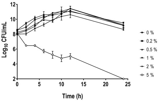 Effect of bile salts on the growth curve of Aliarcobacter butzleri AB_2811 by logarithmic counting CFU/mL in increasing concentrations of bile salts (0.2% to 5%). The graphic represents the mean ± SEM of at least three independent experiments.