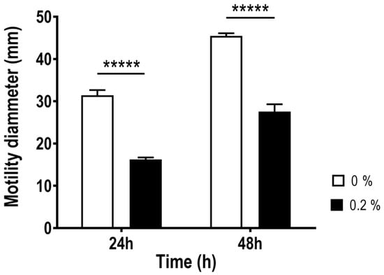 Bacterial motility of Aliarcobacter butzleri Ab_2811 in presence and absence of 0.2% of bile salts. Data match the mean ± SD of at least three independent experiments. ***** p < 0.00001.