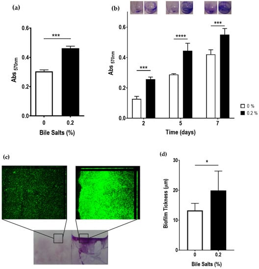 When Ab_2811 strain was exposed to bile salts, the formation of a pellicle in the interface air-medium was observed with both methods, microplate and glass tubes. Therefore, additional assays were performed to confirm and quantify this phenomenon. The phenotype change was confirmed by crystal violet staining of a coverslip vertically positioned during biofilm formation and the biofilm thickness corresponding to the pellicle was assessed. When observing the coverslip, a strong formation of biofilm at the interface air-medium was observed in the presence of bile salts, which was confirmed by confocal microscopy, where an increase in fluorescence was observed at the interface area in the presence of bile salts, when compared with the control (Figure 4c). An informatics analysis performed using COMSTAT software confirmed that, when considering the air-medium interface area, biofilm thickness was significantly higher in the presence of 0.2% of bile salts, when compared with the biofilm thickness in absence of bile salts (Figure 4d).