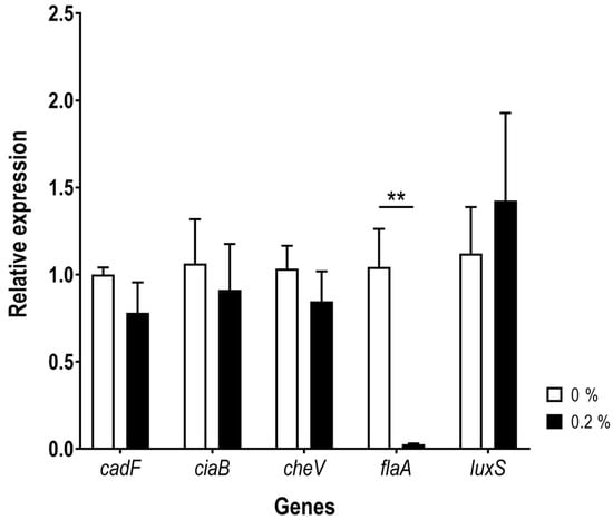 Relative expression of cadF, ciaB, cheV, flaA and luxS genes of Aliarcobacter butzleri Ab_2811 in the presence and absence of 0.2% of bile salts. Data correspond to the mean ± SEM of at least three independent experiments. ** p < 0.01.