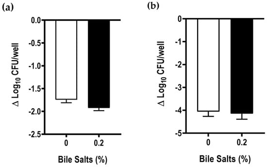 (a) Adhesion and (b) invasion of Caco-2 cell line, after 6 h exposure of Aliarcobacter butzleri Ab_2811 to 0.2% of bile salts. Bacterial survival was determined by variation in the CFU/mL logarithm after 3 h of incubation with the Caco-2 cell line. Data correspond the mean ± SEM of at least three independent experiments.