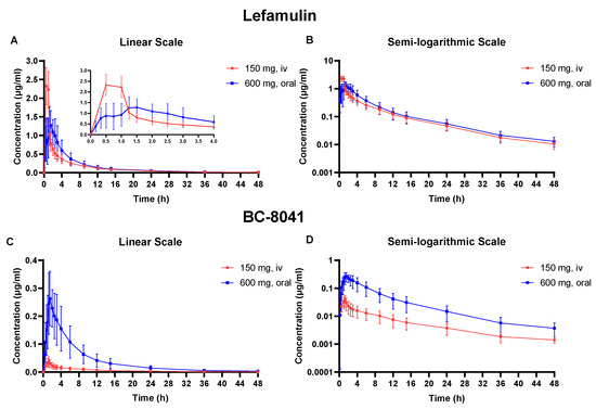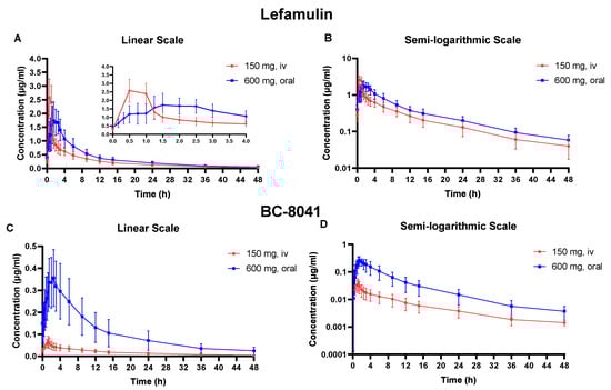 Mean plasma concentration-time curve of lefamulin and its metabolite BC-8041. (A) Linear scale graph of lefamulin after 150 mg intravenous (IV) or 600 mg oral administration; (B) semi-logarithmic graph of lefamulin after 150 mg IV or 600 mg oral administration; (C) linear scale graph of BC-8041 after 150 mg IV or 600 mg oral administration; (D) semi-logarithmic graph of BC-8041 after 150 mg IV or 600 mg oral administration.