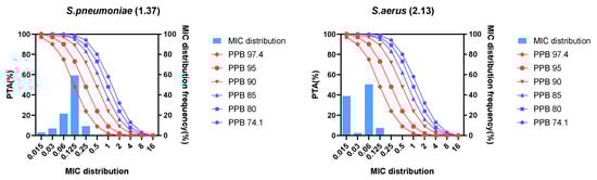 Probability of target attainment and MIC distribution for Streptococcus pneumoniae and Staphylococcus aureus after lefamulin 150 mg intravenous infusion 1 h. PPB, plasma protein binding rate; PTA, probability of target attainment; MIC, minimum inhibitory concentration; S. pneumoniae, Streptococcus pneumoniae; S. aureus, Staphylococcus aureus.