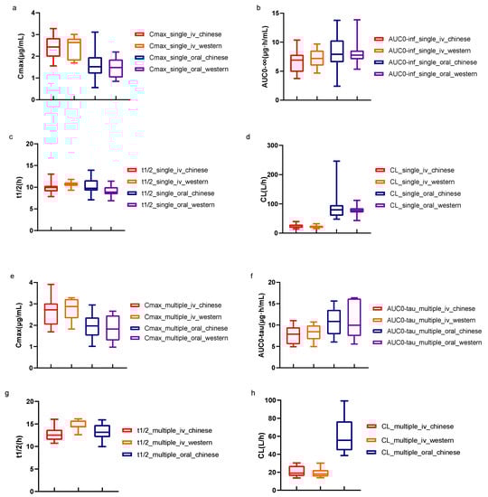 Comparison of PK parameters of lefamulin in healthy subjects between Chinese and Western populations. t1/2 and CL data of multiple-dose oral administration in other countries have not been released. The minimum, median, and maximum values for each parameter were displayed. iv, intravenous; Cmax, peak concentration; t1/2, elimination half-life; AUC0−inf, the area under concentration-time curve (AUC) from 0 to infinity; AUC0−tau, AUC within dosing interval; CL, apparent clearance. (a–d) shows the comparison of PK parameters of lefamulin after single administrations. (e–h) shows the comparison of PK parameters of Lefamulin after multiple administrations.