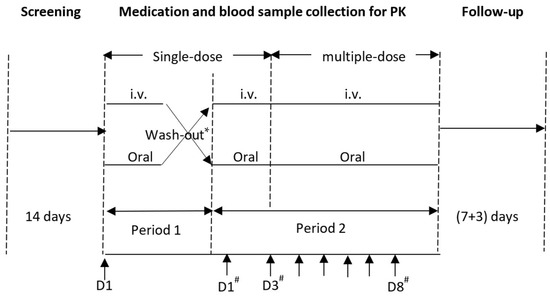 Study design and time axis. * The wash-out period between single-dose administration in period 1 and 2 was 7(+2) days. # Period 2; Medication.