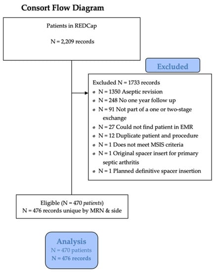 - Wang, Q.; Goswami, K.; Kuo, F.-C.; Xu, C.; Tan, T.L.; Parvizi, J. Two-Stage Exchange Arthroplasty for Periprosthetic Joint Infection: The Rate and Reason for the Attrition After the First Stage. J. Arthroplast. 2019, 34, 2749–2756. [Google Scholar] [CrossRef]