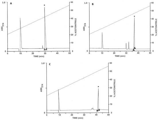 Purification to near homogeneity of (A) TtAP-1, (B) TtAP-2 and (C) Tt-AP3 on a semipreparative Vydac C-4 column. The triangles show where peak collection began and ended. * denotes the peak containing the antimicrobial peptide. The dashed line shows the concentration of acetonitrile in the eluting solvent.