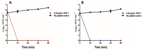 Survival of A. baumannii (DSM 30008) (A) and S. aureus (ATCC 43300) (B) in Mueller–Hinton broth after the addition of 6.25 µg/mL TtAP-1 (equal to 1× MIC). Control incubations were carried out in the absence of peptide.