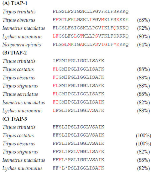 A comparison of the primary structures of (A) TtAP-1 with structurally similar peptides from other scorpion species and poneratoxin-Na1a from the ant N. apicalis, (B) TtAP-2 with peptides similar to TsAP-2 from other scorpion species and (C) TtAP-3 with peptides similar to stigmurin from other scorpion species. Conservative amino acid substitutions are shown in red and non-conservative substitutions in green. Gaps denoted by * have been inserted in some sequences to maximize structural similarity. The numbers in parentheses indicate the % identity with each of the T. trinitatis peptides, respectively.