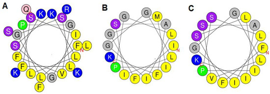 A Schiffer–Edmundson wheel representation of the conformation of (A) TtAP-1, (B) TtAP-2 and (C) TtAP-3. Basic amino acids are shown in blue and strongly hydrophobic amino acids are shown in yellow. The other colours show non-charged residues with varying degrees of hydrophilicity.