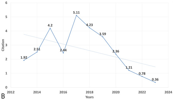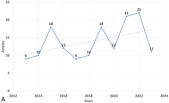 The data indicate fluctuations in the mean total citations per article across the years. In 2015, there was a substantial increase in the mean total citations per article, reaching 37.83, while 2023 recorded the lowest value of 0.36. Furthermore, the number of publications (N) varied from year to year, with the highest number of articles published in 2022 (N = 22) and the lowest in 2013 (N = 9). Figure 1 illustrates the publication trend over the years (Figure 1A).