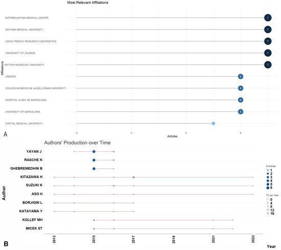 Most productive authors, institutions, countries and their collaboration network (A). (B) Ten most-contributing authors and their production over time on the antimicrobial resistance among pneumonia pathogens (2013–2023).