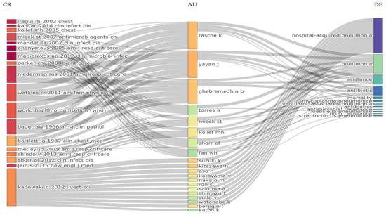 Three-Fields Plot representing the incoming and outgoing flows among cited references, authors and author keywords contributing to antibiotic resistance among pneumonia pathogens (2013–2023). Abbreviations: CR, cited references; AU, authors; and DE; keywords. Explanations of the right columns (DE) from top to bottom: hospital acquired-pneumonia; pneumonia; resistance; antibiotics; mortality; Mycoplasma pneumoniae; ventilator-associated pneumonia; antibiotics; antimicrobial resistance; Klebsiella pneumoniae; drug resistance; Streptococcus pneumoniae.