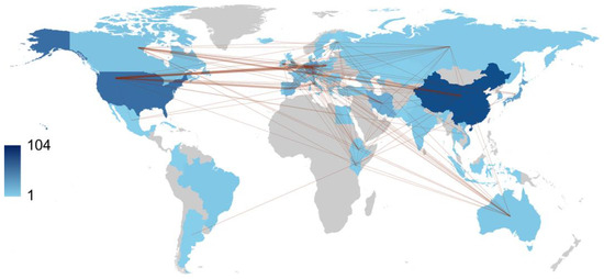 Over the course of one decade, China and the USA led the scientific production among countries with 104 and 101 publications, respectively, followed by Japan with 50 publications, Spain with 32, and Vietnam with 30 (Table 3). Regarding publication patterns, China exhibited a significant tendency for single-country productions, with 83.7% of its publications. Similarly, the United States demonstrated a high rate of single-country publications at 82.2%. In contrast, Germany engaged in collaborative research, with 65.4% of German authors’ publications being co-authored with researchers from other countries. Collaboration strength was mostly derived from the United States and European countries (Figure 5).