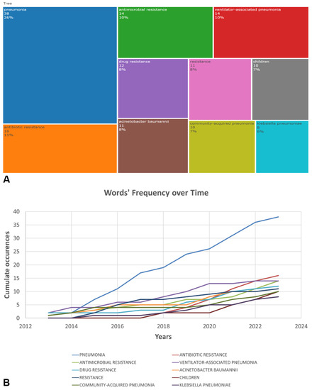 TreeMap (A) and scatter plot (B) representing top ten author’s keywords in the research on the antimicrobial resistance among pneumonia pathogens (2013–2023).