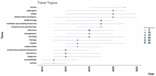 Our bibliometric study incorporated research related to all the aforementioned pathogens. Between 2017 and 2019, S. pneumoniae was identified as one of the trending topics. Reports of multidrug-resistant strains of S. pneumoniae have been published since the late 1970s [53]. The global rise in antibacterial resistance within pneumococci continues, particularly affecting β-lactams and macrolides [54,55]. In nations like France and Spain in Europe, up to 40% of pneumococcal strains exhibit resistance to multiple drugs [56].