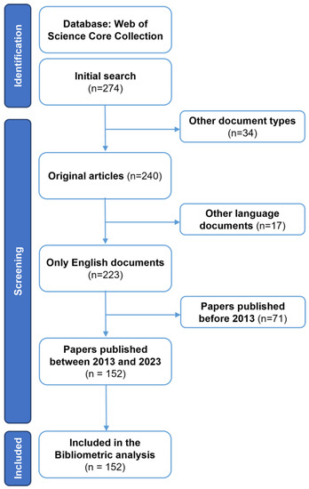 In this study, performance analysis and science mapping were conducted using specific software tools. Rstudio v.4.3.1 with the bibliometric R-package (http://www.bibliometrix.org; access date: 19 July 2023), was utilized for these analyses [65]. Biblioshiny, with its web features, was employed for data analysis. This software has the capability to function with a single database only. WOS was chosen due to its provision of comprehensive and detailed citation information. This feature is particularly valuable for conducting thorough bibliometric analysis and assessing the impact of research outputs.
