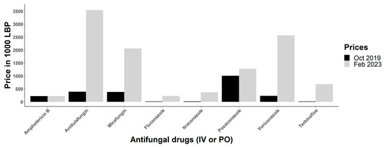 Increase in the prices of available antifungal drugs between October 2019 and February 2023. Before the economic crisis, 1000 Lebanese pounds (LBP) was equivalent to 0.67 USD. Currently, 1000 LBP is equivalent to ∼0.01 USD. All included antifungals are PO (by mouth) or IV (intravenous).